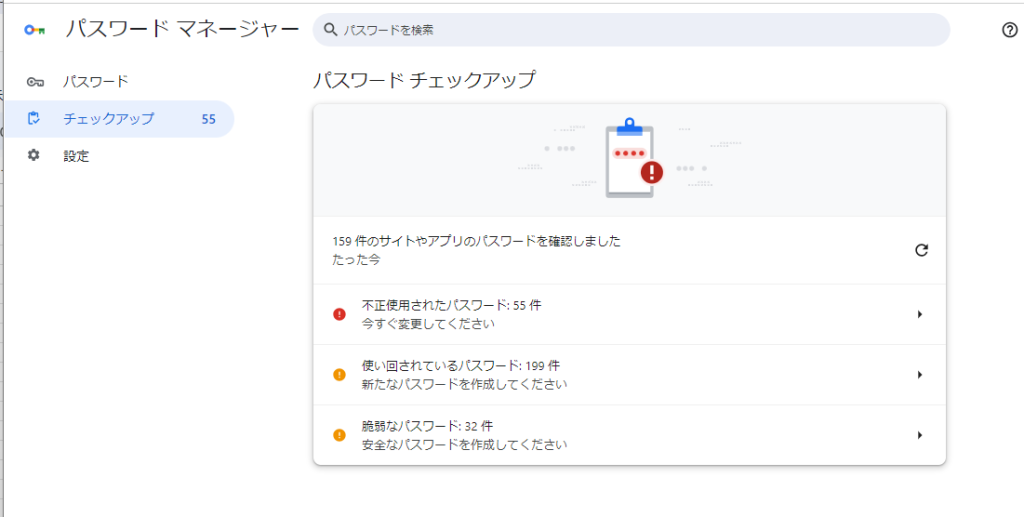 「パスワード マネージャー」が開いたら「チェックアップ」をクリック。すると「不正使用されたパスワード:55件」との表示。これはヤバい!