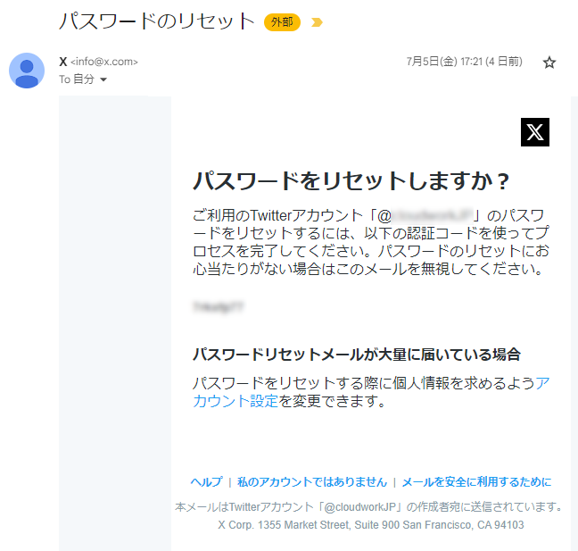 長年続いているXの場合、セキュリティ対策も進化しており、パスワードリセットに本人確認の手順があったので被害に遭わずに済みましたが。