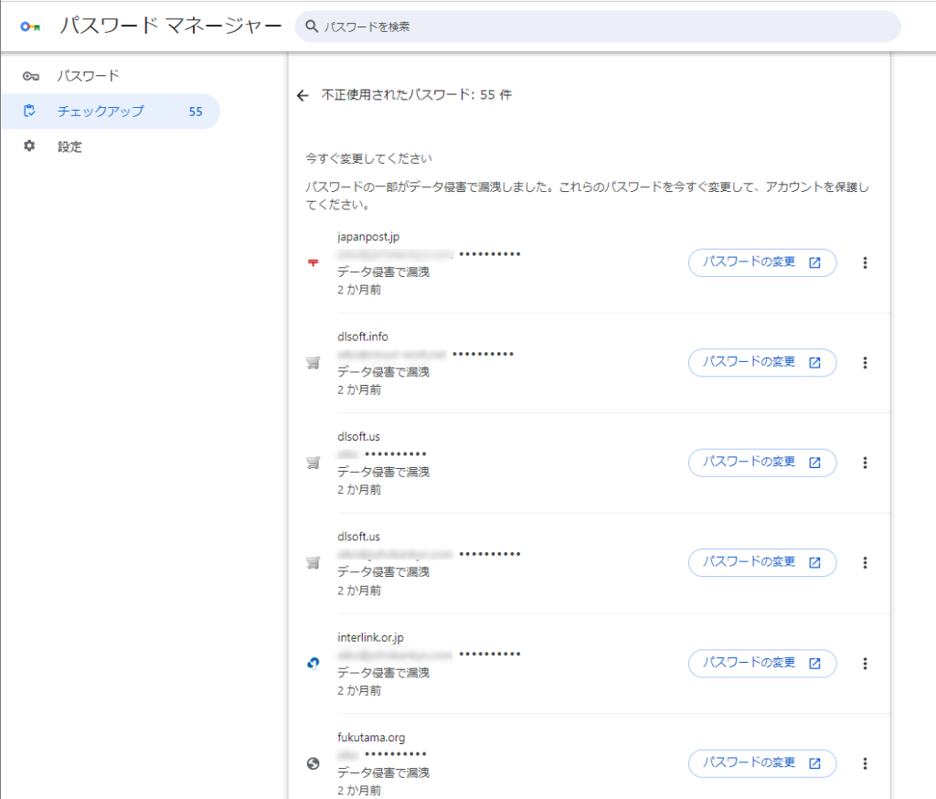 「不正使用されたパスワード:55件」の詳細を見てみると、登録していたことを忘れてしまっているサイトばかり。各項目の右にある「縦に3つ並んだアイコン」をクリックして「パスワードを表示」させてみると、懐かしい8桁のパスワード。