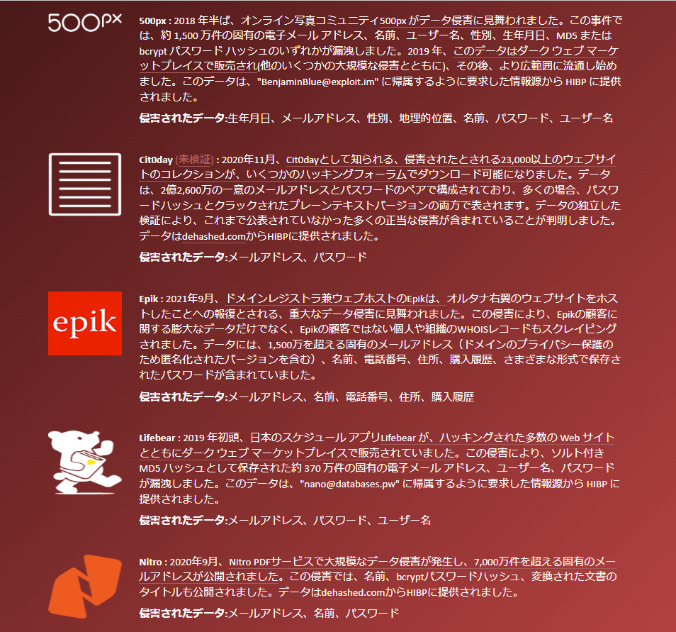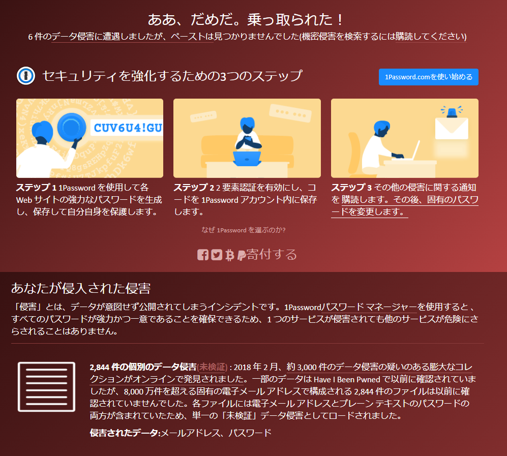https://haveibeenpwned.com すべてのアドレスで確認をしたところ、もう一つのアドレスが漏洩されてしまっていました。