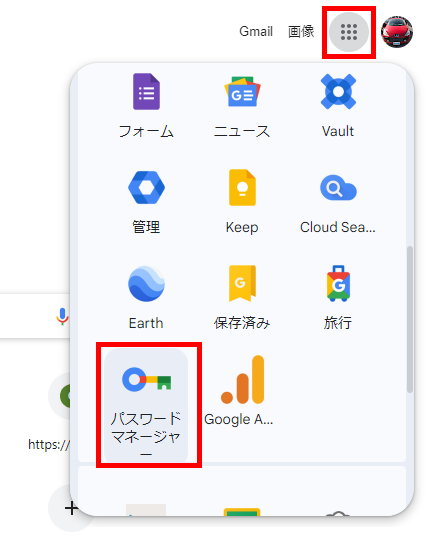 Google Chromeで画面右上の自分のアカウントのアイコンをクリックし、「鍵アイコン」をクリックするか、Googleのメニューアイコンから「パスワードマネージャー」を開いてもOK.