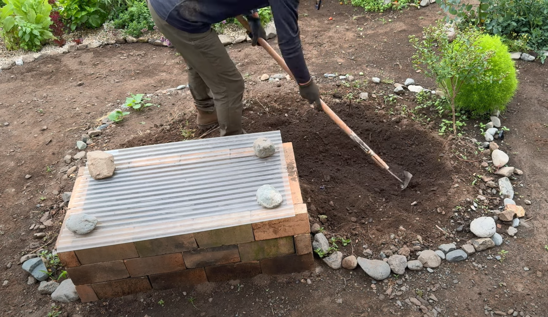 36個のレンガを積み木のように積み上げて、ホームセンターで購入した波板を蓋にして、コンポストにしてみました。