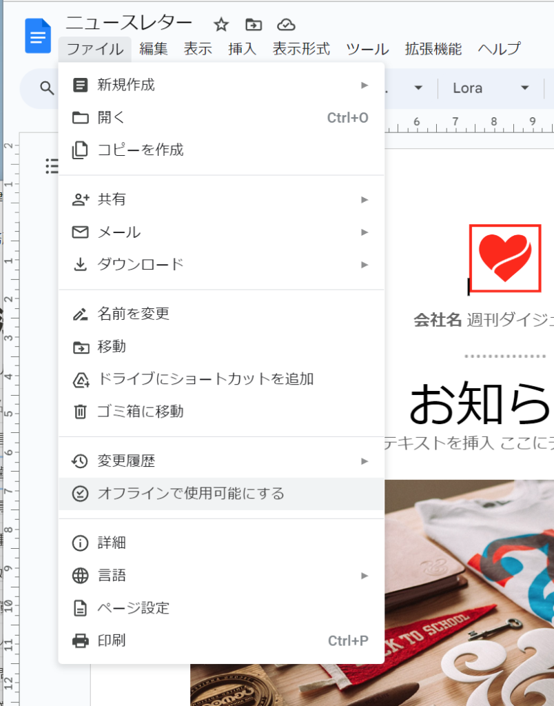 「ファイル」>「オフラインで使用可能にする」を選択しておくと、インターネットにつながっていない状態でもファイルの編集が可能となります。
