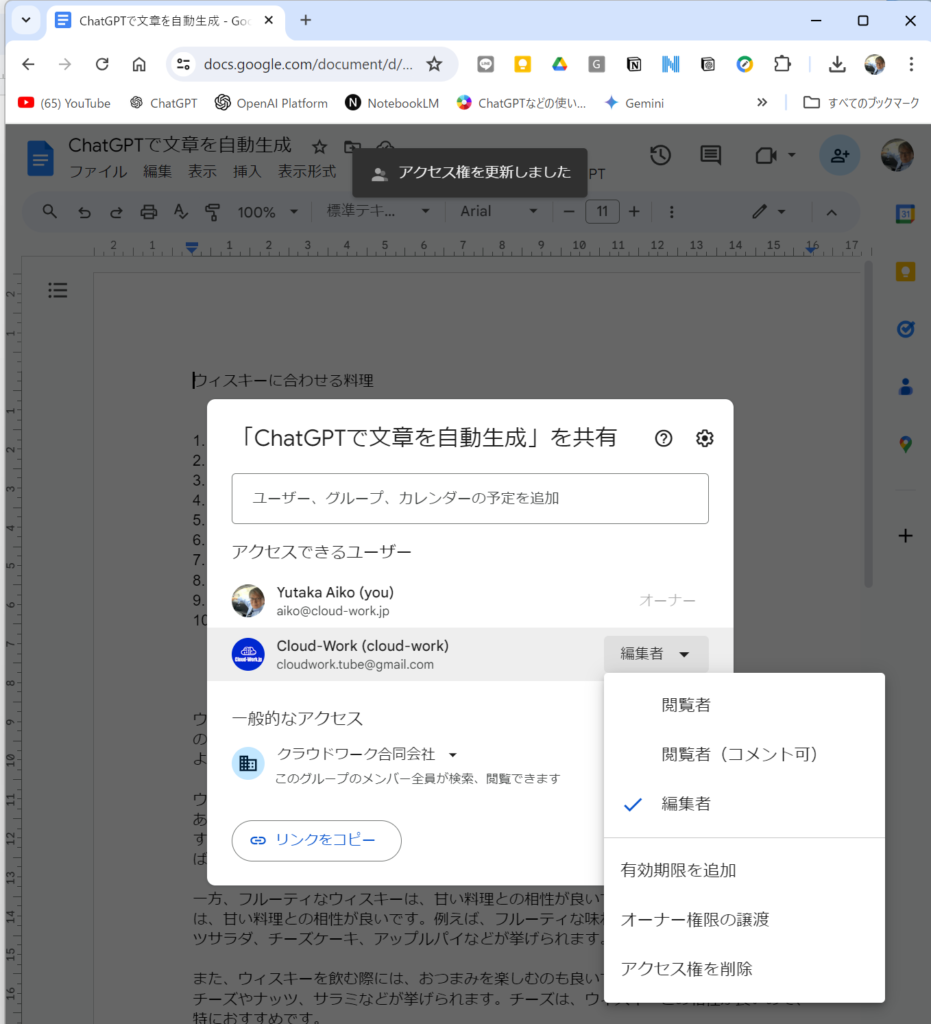 MS Wordではファイル共有自体がやや煩雑で、権限設定もややこしいのですが、Googleドキュメントでは、クラウド上の「Googleドライブ」上に置かれているファイルを簡単に共有することができます。また、共有相手ごとに閲覧のみ可能、コメントのみ可能、編集可能といった権限を設定できます。